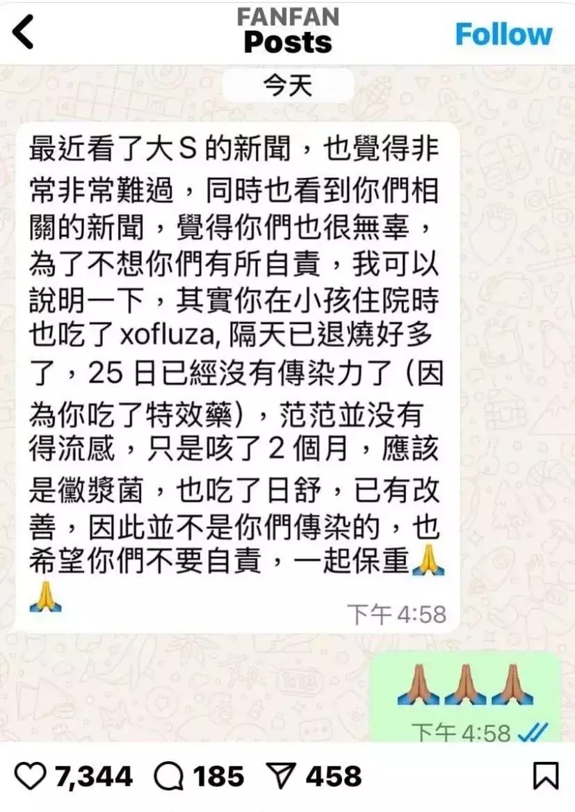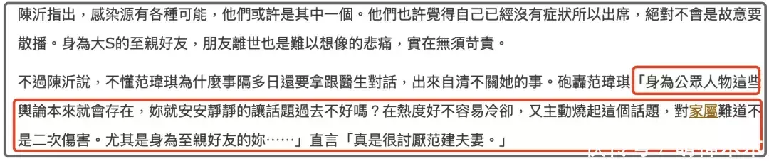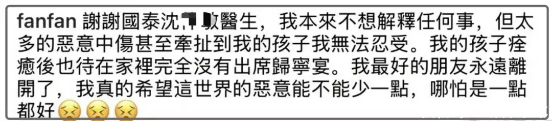 其实这段聊天记录并没有什么问题,关键是范玮琪拿到截图发出来之后,直接点名道姓感谢这位叫沈某的医生,范玮琪称自己本来不想解释这件事,但是太多恶意的评论伤害到了自己和孩子,当时孩子痊愈后在家待着没去参加宴会,所以大S感染甲流这件事跟自己家完全没关系,自己最好的朋友离开了,希望网友对他们一家的恶意少一点。