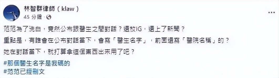 还有台湾省那边的律师也怒批范玮琪,为了洗白自己直接公开了这位医生的名字,闹到现在都上新闻了,要说范玮琪不公开对方的名字也能理解,关键是范玮琪连人家在哪个医院都说出来了,这不明摆着把这位医生往风口浪尖推么?更难绷的是,也许是医生私自联系了范玮琪,后来范玮琪又把这条动态删除了,这真是越描越黑。